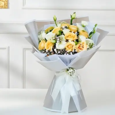 باقة ورد جوري شمامي واستوما ابيض مع تغليف فضي وشريط انيق