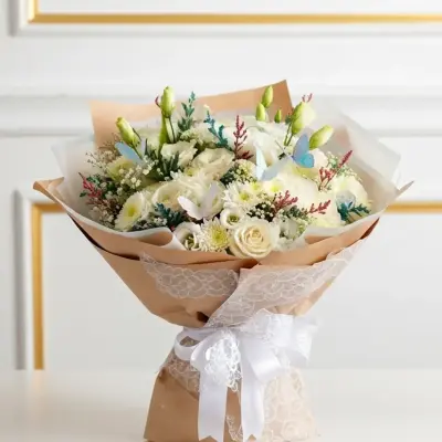 بوكية ورد جوري أبيض طبيعي مع كريز أبيض مع تغليف وشريط انيق