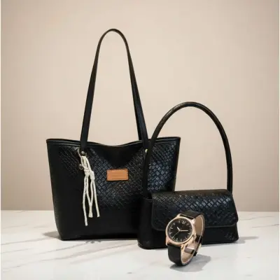 طقم أساسي وعملي يركز على حقائب اليد الجلدية بتصميم النسيج أو الجديلة (Woven/Braided texture) في لونين أساسيين: الأسود الكلاسيكي والبني الكاميل (Camel Brown) الدافئ. التكوين: تتكون كل مجموعة من حقيبة كتف/توت كبيرة (Tote Bag) وحقيبة يد أصغر بتصميم مميز. التفاصيل: الحقائب مزودة ببعض تفاصيل الزينة مثل شراشيب (Tassels) بلون فاتح. الإكسسوار: يرافق كل طقم ساعة يد جلدية متناسقة في اللون مع الحقائب (إما سوداء أو نحاسية)، مما يجعل الطقم متكاملاً للاستخدام اليومي أو العمل