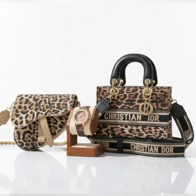 طقم “ليوبارد” الجريء (3 قطع) يجمع حقيبتين بتصميم أيقوني مع ساعة راقية بنفس نقشة النمر الفخمة، لإطلالة قوية ولا تُنسى… عرض محدود لا يفوتك.