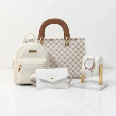 طقم نسائي فاخر 4 قطع – أبيض بنقشة مونوغرام طقم متكامل يمنحك إطلالة متناسقة وأنيقة، يضم حقيبة يد بحجم مثالي، حقيبة ظهر صغيرة عملية، محفظة يد راقية، وساعة كوارتز بيضاء بإطار ذهبي وردي ناعم. مناسب للعمل والخروجات اليومية.