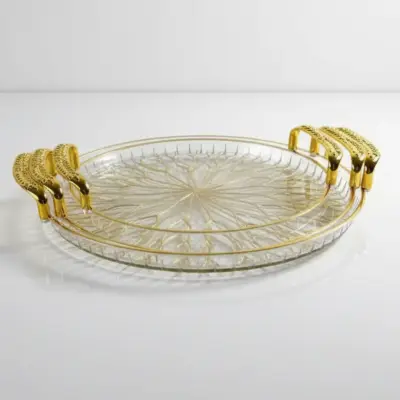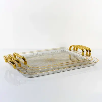 طقم صواني أكريليك فاخر – 3 قطع طقم صواني شيك بتصميم راقٍ يضيف لمسة أناقة لضيافتك. مصنوع من أكريليك بيور مقوّى عالي الجودة، مع مقابض ذهبية مزخرفة ولمقاسات عملية تناسب جميع الاستخدامات. المميزات: • أكريليك متين مقاوم للكسر • مقابض ذهبية أنيقة • 3 قطع بمقاسات مختلفة • جودة مستوردة عالية