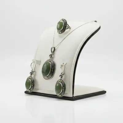 طقم فضه تركي على عقيق يمني اخضر يشم