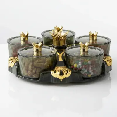 طقم علب تقديم دوّار 360° – فخامة وتنظيم مثالي طقم تقديم أنيق بتصميم عصري دوّار يسهّل الوصول للمكسرات والحلويات بكل راحة. مصنوع من أكريليك عالي الجودة بلمسة شفافة فاخرة مع تفاصيل ذهبية تضيف طابعًا ملكيًا. المميزات: • قاعدة دوّارة 360° لسهولة الاستخدام • 5 علب متعددة الاستخدام مع أغطية • تصميم فاخر بلمسات ذهبية أنيقة • خامة قوية وعملية تشبه الزجاج • حجم مثالي للطاولة دون أخذ مساحة مثالي للضيافة والمجالس ليمنحك ترتيبًا وأسلوبًا راقيًا