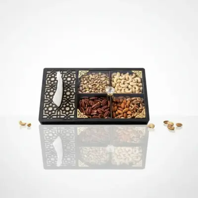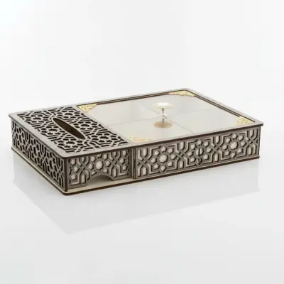 شيالة المكسرات والمناديل الفاخرة – الحجم الكبير أضف لمسة فخامة وتنظيم لطاولة ضيافتك مع هذه الشيالة الأنيقة المقاس الكبير: الطول 40 سم × العرض 27 سم تصميم عملي وأنيق: عدة أقسام لتقديم المكسرات والحلويات بطريقة مرتبة وجذابة مكان مخصص للمناديل: كل شيء في قطعة واحدة أنيقة وسهلة الاستخدام مثالية للضيافة: للمجالس، المناسبات، والأعياد هدية رائعة: تصميم فاخر يميزها كهدية للأهل والأصدقاء